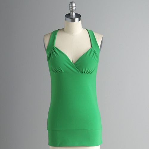 A black lace top over a green tank top, a brown skirt, and black and white oxfords. For jewelry, gold drop earrings and gold and brown bangles.